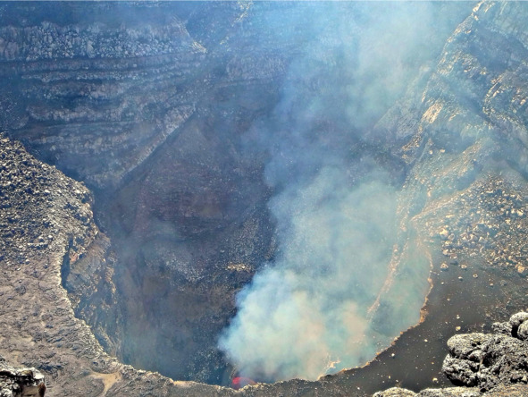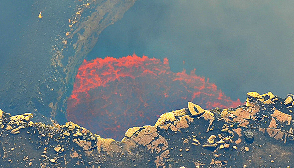Я смотрела в кратер на бурлящую и кипящую лаву – красная, она хорошо видна даже днём. Лава перекатывалась волнами, издавая вулканический запах. Ядовитый дым поднимался вверх и уносился ветром в сторону, поэтому вполне можно было дышать без маски.