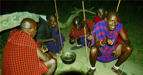 Брат Эсты Толег появился вовремя, и уже в темноте, позвал меня за собой. Женщины и дети остались у очага ждать мужчин. Эста меня подбодрила, отправляя с братом. Освещая путь фонарём, который имеет тут каждый масаи, мы пошли в лес. В лесу горел костёр и было много мужчин. Вокруг костра на деревянных штырях жарилось мясо. В тот вечер зарезали козу. Помыла руки речной водой и приготовилась к ужину. Перед едой все совершали омовение и после еды тоже, ведь все тут кушают руками. Толег и Монти при помощи мачете настрогали мясо для меня от задней козьей ноги прямо горкой на листья и заставили всё съесть. Кто-то принёс маленькую горстку соли в целлофане, припасённую для особого случая. Было невероятно вкусно. Мясо на удивление оказалось мягкое и сочное.