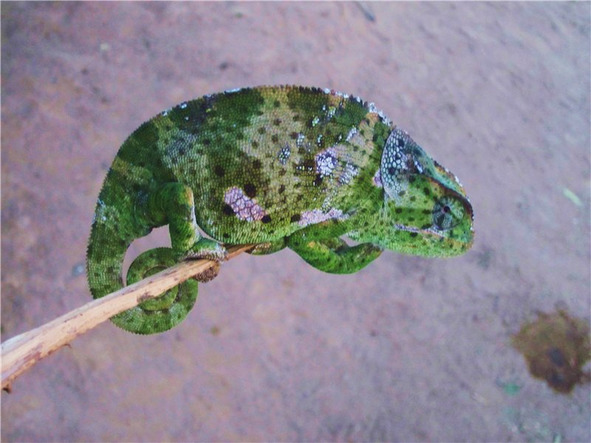 В округе моего проживания обитало огромное разнообразие хамелеонов, многие были похожи на зелёные веточки. При моём приближении хамелеоны просто замирали в одной позе, лишь только маленькие глазки бегали по сторонам. Вообще хамелеон имеет способность смотреть одновременно двумя глазами в разные стороны, при этом один глаз может быть не подвижным, а второй быстро бегающим. Я брала ящериц в руки, что бы рассмотреть со всех сторон, а они отталкивались от меня лапками и хвост кольцом заворачивали. Потом узнала, что хамелеоны бывают кусачими.