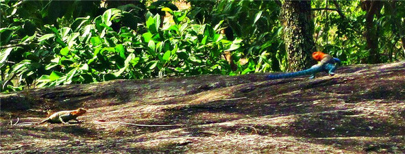 Кроме хамелеонов в лесу по камням грелись разные ящерицы. Особенно мне нравились красноголовые агамы, которые после обеда лежали на прогревшихся монолитах. Тело ящериц имело совершенно голубой окрас с ярко оранжевой или же алой головой. Движения агам юркие, как и должно быть, поэтому исчезали они очень быстро, но я всегда держала фотоаппарат наготове. Эта ящерица называется Агама колонистов, довольно интересное имя. Является одной из самых красивых ящериц в мире, хотя самки всего лишь зеленовато-бурые в красных пятнышках, так сказать красотой не блещут.