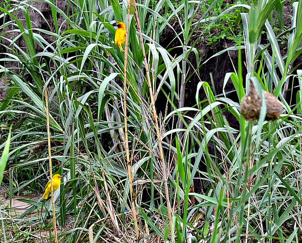 Набрала лимонных листьев для своего чая из корней и тоже всё в сумку. Нарадоваться не могла на чудесный лес, потом заросли камыша начались. Маленькие разноцветные пичуги по-воробьиному чирикали. Повсюду круглые гнёзда по камышу развесили. Это птицы ткачики облюбовали речное захолустье, пристроив свои домики чуть ли не на травинках. Жёлто-чёрно-алые они сидели везде, дружно уживаясь по соседству и летая одной стаей. Напоминали разноцветных попугайчиков, которых часто встречала в Латинской Америке. В Африке видеть попугаев мне не доводилось.