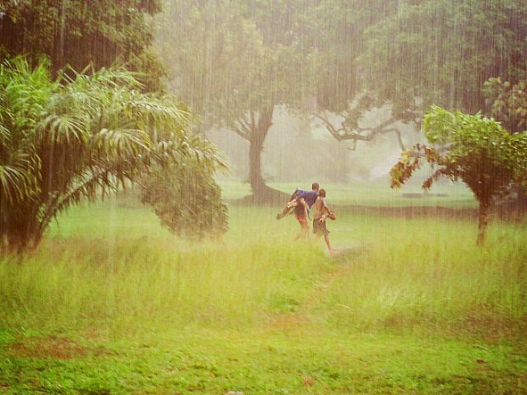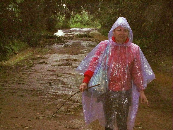 Мысли о крокодилах, которые выползли в траву и ждут нас, были высказаны вслух. Решили, что по глубокой воде не побежим, а будем пробираться по островкам. Взяли в руки по шесту и пошли, прощупывая глубину. В дождевиках было тепло, верхняя часть тела оставалась сухой. Я оценила их надобность, несмотря на хлипкий вид и некрасивость.