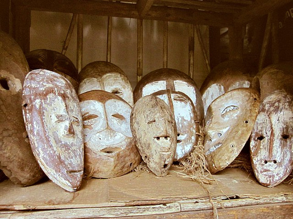 Пока нам оформляли въезд, мы разглядывали сувениры в частной лавке. Среди всего прочего продавались странные маски с белым налётом, видно, что далеко не новые, а какие-то ритуальные. Позже водитель пояснил, что их лучше не покупать, они из конголезских захоронений, а принесли их местные крестьяне на продажу.