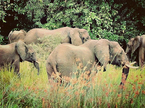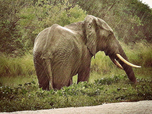 Огромные нильские крокодилы лежали в тени деревьев не шевелясь и не мигая. Они всегда рядом с бегемотами, те срыгивают излишки пищи, а крокодилы доедают. В природе свой баланс. Не успели мы ещё на них насмотреться, как пошёл крупный дождь, дымкой затянуло реку и неожиданно для нас из этой пелены выплыл огромный чёрный африканский слон.