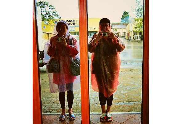 В Мусанзе мы приехали под проливным дождём. Он планомерно поливал бурлящий потоками и блестящий лужами город. Тонкие и прозрачные дождевики мы всегда имели в своих сумочках, поэтому быстренько в них упаковались и оттого, что никуда не спешим и нам просто нечего делать, сфотографировали себя в стеклянной витрине.