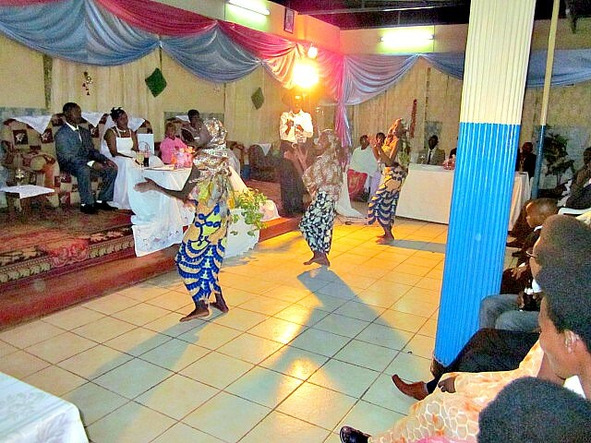 Мы уселись на свободные места, чем сразу привлекли к себе внимание. Супружеская пара торжественно восседала на сцене, тамада с микрофоном кружил по залу, а видеокамеры на «ножках» услужливо снимали торжество. Белое платье чёрной невесты раскинулось по полу и ни чем не отличалось от европейского стиля.