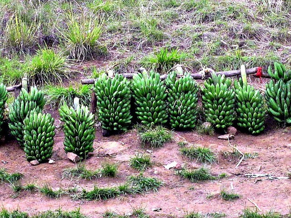 Проезжая по бурундийским деревням, мы только своим присутствием вынуждали торговцев всякой всячиной бежать за автобусом, засовывая в наше окно всё, что пропихивалось. Сбиваясь в кучу под нашими окнами люди предлагали скупить упаковки с печеньем, полуметровые куски сахарного тростника, плетёные корзины, а к ним охапку ананасов, здоровенные пакеты с морковью, мешки с углями для жарки баранов и даже двадцатикилограммовые гроздья кормовых бананов, что совсем неаппетитно зеленели вдоль обочин. А уж если вы что-то ненароком потрогали, значит вам это надо, тут уж не отвертеться. Потрогали мы бананы и нашим водителям пришлось купить по одной гигантской грозди, едва дотащив до автобуса. Используют их вместо хлеба, отварив наподобие картошки.