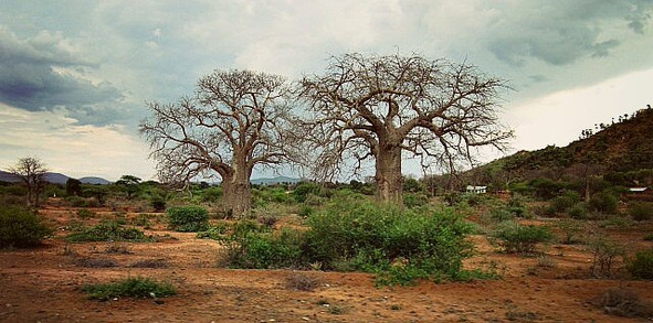 Постепенно закончились зелёные манговые склоны и начались баобабы. Жара. Они здесь совсем другие, без листьев, одни голые сучья, словно сухостой. Но деревья живые, с первыми дождями появится листва и цветки, что живут всего сутки и вянут осыпаясь. Баобаб уникальное дерево, его плоды съедобны, кора необходима в хозяйстве и медицине, а мягкий пористый ствол обожают слоны. Вырывая полностью молодое деревце с корнем и разрывая его на части слоны поедают растение без остатка.