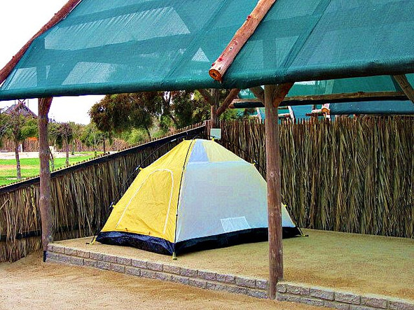 Территория кемпинга обширна, разделена на сектора травяными заборами. Каждый сектор имел тканевую прозрачную крышу, ведь дождей не бывает, как и солнца. Здесь уже стояли три машины с людьми, а я, «безлошадная», стала четвёртой. Палатку поставить мне помогли, розетки рядом имелись, но адаптер для зарядки батарей выдали отдельно, ведь африканские розетки совсем не подходят под наши зарядные устройства.