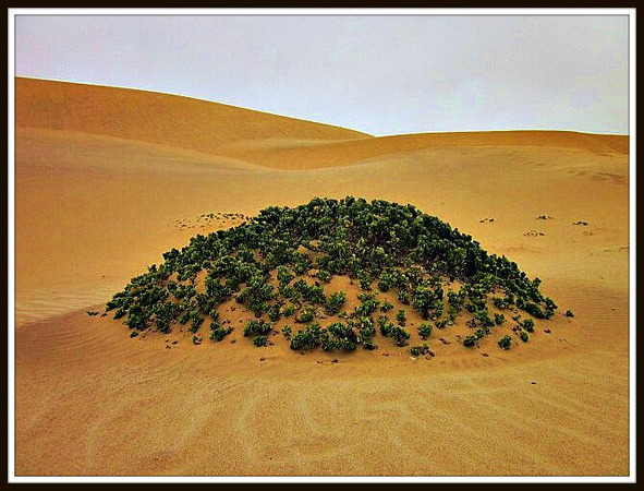Сразу за городом начались гигантские дюны Намиба. С чем можно сравнить их красоту? Горы чистейшего сыпучего песка: красного, жёлтого, оранжевого, белого незыблемо вырисовывались на фоне серого неба. Иногда ветер закручивал на их хребтах небольшие вихри, что делало дюны похожими на сказочные вулканы. Ярко-зелёное пустынное растение парнолистник украшало их своими круглыми клумбами, листья которого были мясистыми, как у аллое.