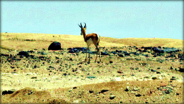 Безжизненными их не назовёшь, всё-таки растения здесь имелись, да и животные тоже. Красивые антилопы ориксы паслись небольшими табунами. Если они не двигались, то на фоне песка и камней просто не были видны. Я замечала их только во время движения. Они с прямыми длинными рогами поднимались друг за другом на пригорки, ярко вырисовываясь на синем небе, чтобы вновь скрыться за горой. Эти антилопы приспособились жить с температурой тела в 42 градуса, что для остальных крупных животных просто губительно.