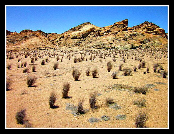 Дорожные знаки с обозначением животных закончились, а вместо них появились новые предупреждающие, чтобы пустыню не засоряли и берегли её пуще себя. Это уже был Намиб. Его горячее дыхание было страшным, всё иссушающим и всё уничтожающим. Враждебная жизни прибрежная пустыня у Атлантического океана существует со времён динозавров, она никогда не исчезала и не появлялась вновь. Ничтожное количество осадков в год, примерно 10 мм, получает эта зловещая пустыня у океана. Безжизненные сухие русла рек в колючках и в редкой жёлтой траве причудливо извиваются по каменистому грунту. Годами они остаются сухими, ожидая особо влажного лета, когда наполнят их бурные потоки, несущие свои воды из дождливых регионов Африки. Была в этом во всём своя красота, строгая, не напыщенная, хоть и жестокая.
