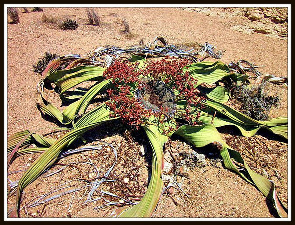 В этом месте всего 13 деревьев и каждое камешками обложено, чтобы не наехали. Среди них самому молодому дереву вельвичии 75 лет, а самому взрослому 500, но живут сии интересные деревья до двух тысяч лет, и только в некоторых местах Намиба. Два листа они имеют по три метра каждый, которые стелются по песку. В процессе жизни листья раздваиваются, расслаиваются, создавая впечатление, что их много. Похожи они на кожистые зелёные ленты, растут всю свою долгую жизнь, но очень медленно. Ствол у вельвичии настоящий, толстый, деревянный, а высотою всего 15 сантиметров. Он корявый и низкорослый, а меж двух листьев – цветок. Причём существуют две особи у дерева – мужская и женская. Женский цветок – это осыпавшиеся лепестки с прикреплёнными семенами и чёрный пестик, как будто бы его сожгли, но удивительно, что тоже деревянный. А у мужского цветка ярко-красное соцветие, усыпанное пыльцой и засиженное насекомыми.