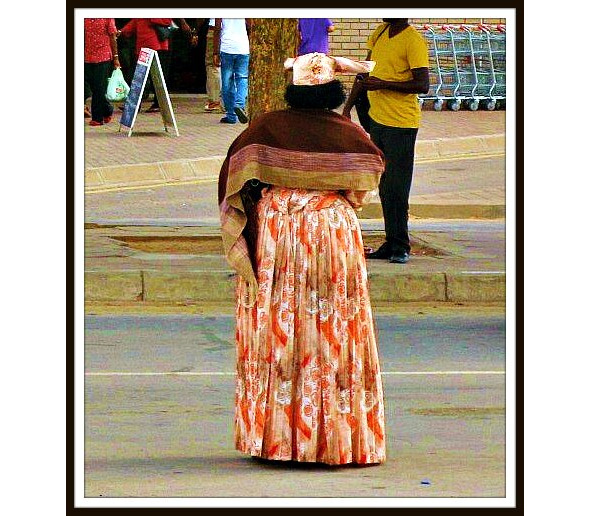 В нашем автобусе находились всего четыре пассажира, но задержек с выездом не было. Так здесь всегда – хоть два пассажира в салоне, автобус всё равно уйдёт вовремя. На всякой остановке я наблюдала за женщинами гереро, они важно двигались, а их платья в сборочку напоминали колокола. У некоторых вместо рогатого головного убора были повязаны впереди банты. А если надо было нести на голове поклажу, то вся красота с головы просто убиралась. Фотографироваться они не любители. От камеры отворачивались и быстро уходили. Было очень жаль. Поэтому фотографии делала самовольно в неудобных ракурсах.