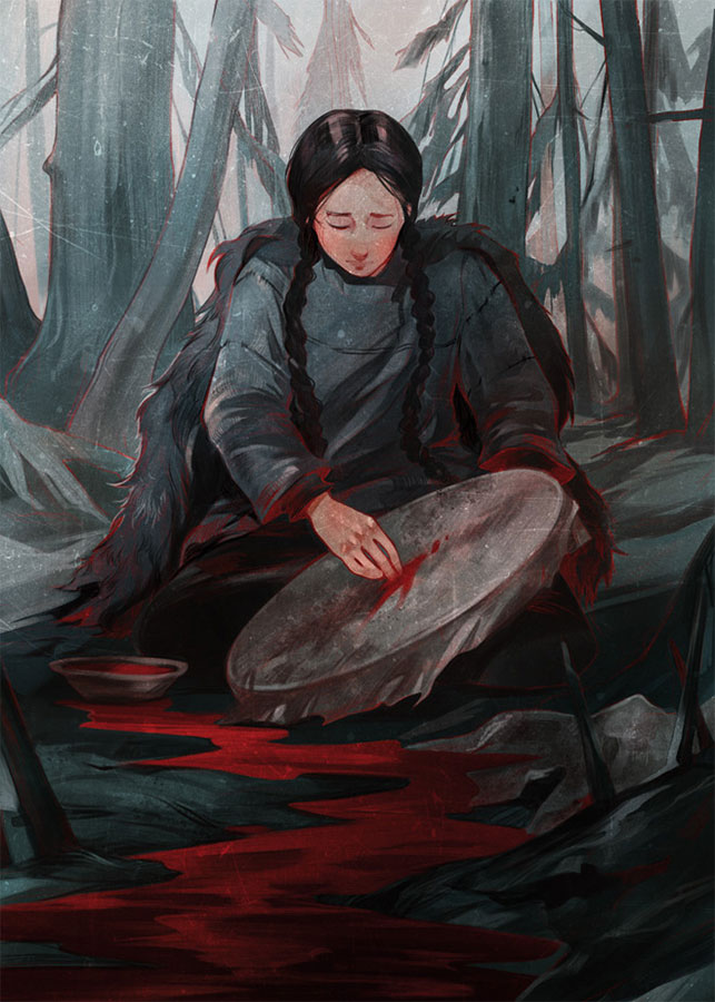 Джалар побежала неслышно по утреннему лесу без тропинки, наугад, доверившись чутью. Вдруг замерла, прищурилась. Темный след тянулся по хвое. Пах железом и будто пульсировал. Она скинула тяжелое одеяло, в которое куталась, когда уходила надолго, пошла быстрее. И тут же услышала жалобный стон. Джалар медленно двинулась ему навстречу. Кровавая полоса терялась в рыжих папоротниках, окружавших сосну, где Джалар жила до того, как перебралась в оленье логово. Она раздвинула кружевные папоротниковые перья и увидела Вийху.