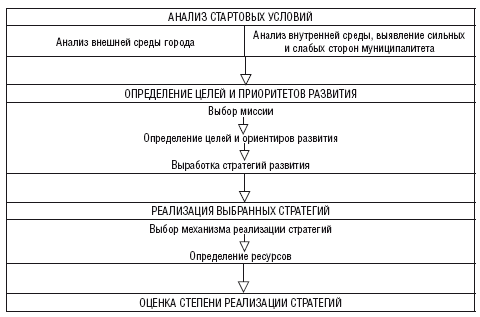 Планирование социально-экономического развития города имеет сходство со стратегическим планированием в бизнесе и включает в себя несколько классических этапов. Существуют разные варианты обозначения этапов создания плана городского социально-экономического развития, однако их различия не носят принципиального характера. Процесс стратегического планирования представляет собой ряд последовательно выполняемых этапов, которые можно объединить в четыре блока (рис. 3).