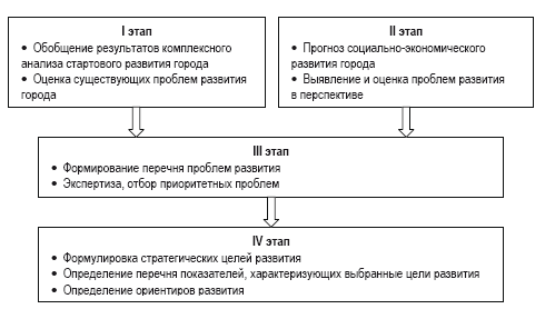 Процесс формирования целей развития города на перспективу также осуществляется в несколько этапов (рис. 4), при этом первые два этапа могут выполняться параллельно. Особо следует подчеркнуть важность четвёртого этапа, на котором происходит не только качественное, но и количественное определение целей. Это создаст объективные предпосылки для разработки системы мер по реализации и организации действенного контроля за их достижением.