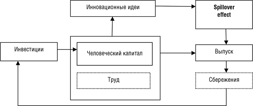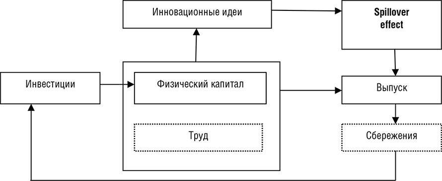В моделях с накоплением физического капитала предполагается, что воплощенные в нём технологии и знания становятся общественными благами и под влиянием эффекта распространения новшеств (spillover effect) оказывают воздействие на рост производительности труда во всей экономике (рис. 1.3).