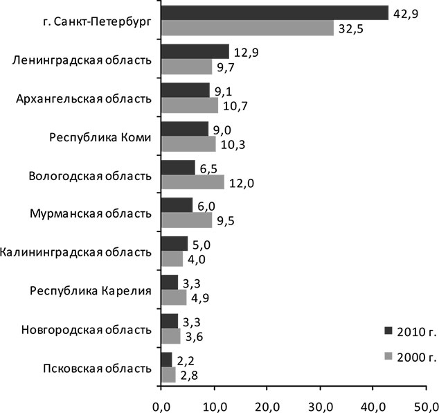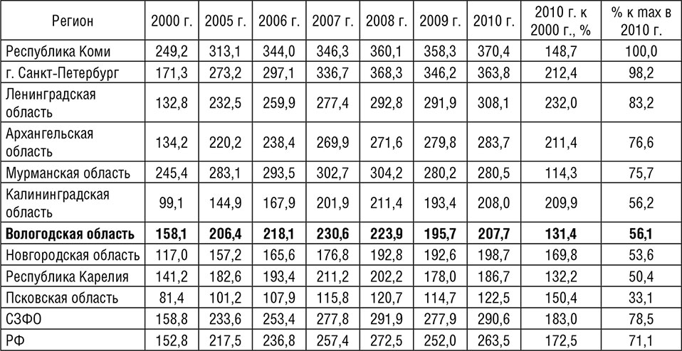 По величине валового регионального продукта в расчете на душу населения в 2010 г. лидировали Республика Коми, г. Санкт-Петербург и Ленинградская область, Вологодская область находилась на 7 месте. Отставание Псковской области от региона-лидера – Республики Коми – было почти трехкратным (табл. 2.1). Наибольший рост ВРП в период с 2000 по 2010 г. достигнут Ленинградской областью, наименьший – Мурманской.