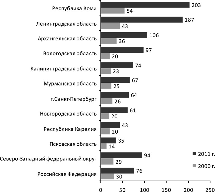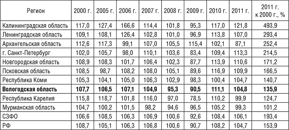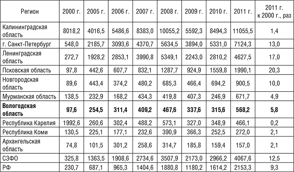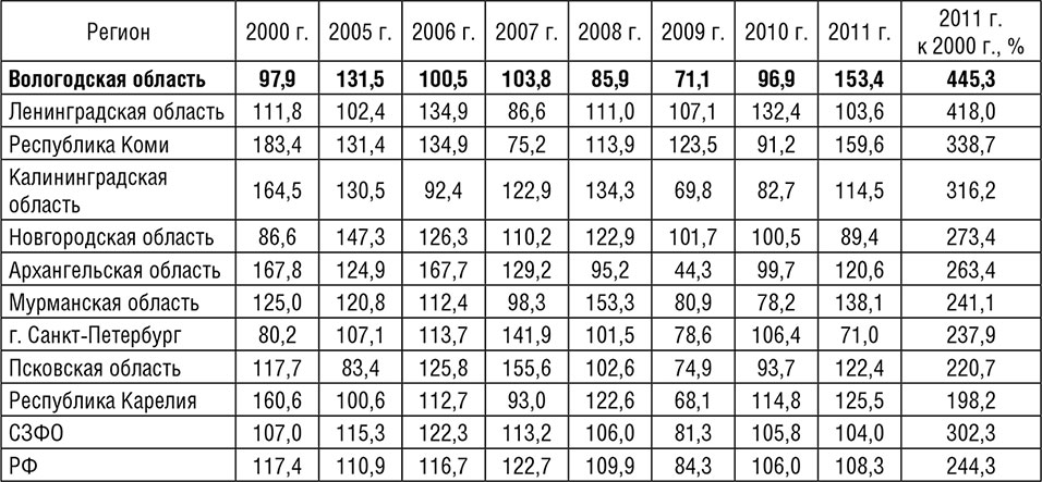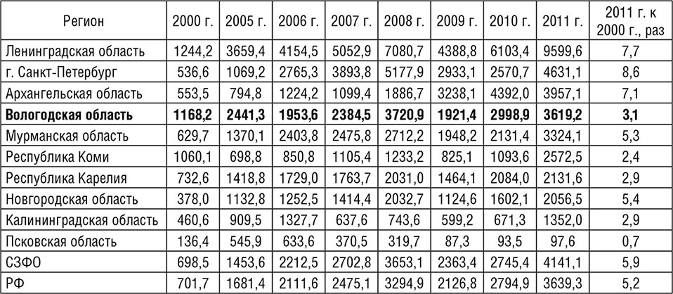 Однако в целом за 2000–2011 гг. в Вологодской, Ленинградской, Калининградской областях и в Республике Коми рост инвестиций был выше, чем в среднем по СЗФО и России.