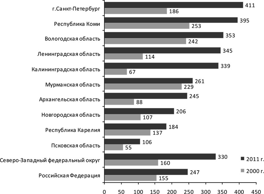 За период с 2000 по 2011 г. импорт увеличился в 12,5 раза (табл. 2.4). Наибольший его рост был характерен для Псковской и Ленинградской областей, г. Санкт-Петербурга. По показателю импорта в расчете на душу населения лидируют Калининградская область, которая в силу своего анклавного расположения вынуждена активно взаимодействовать с окружающими ее государствами, и Санкт-Петербург.