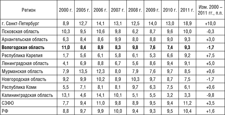 Таблица 2.6. Инновационная активность организаций в регионах СЗФО в 2000–2011 гг., %