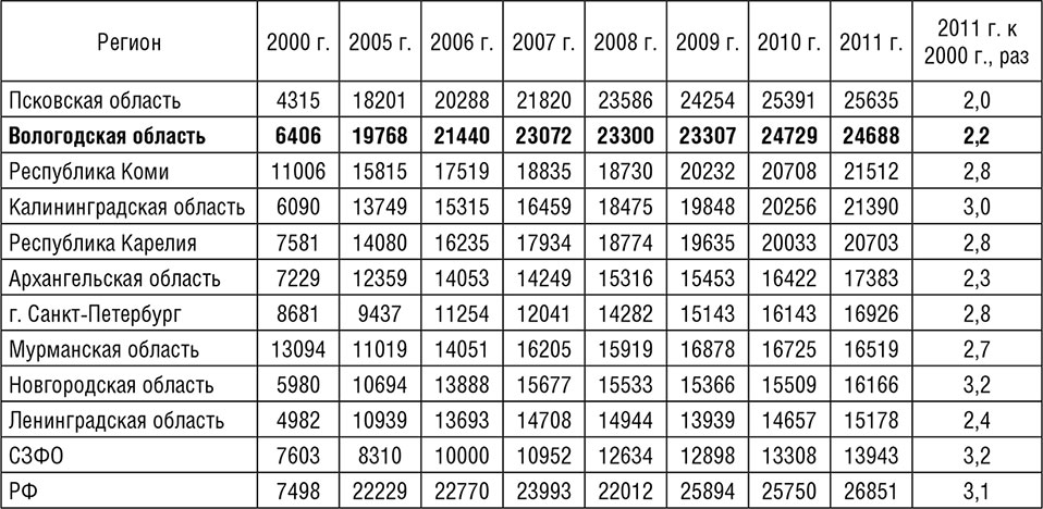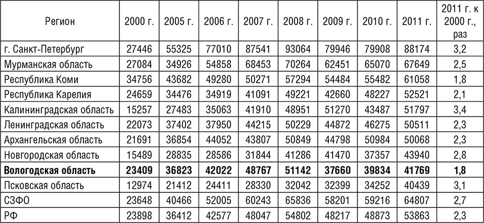 Таблица 2.1. Валовой продукт на душу населения регионов СЗФО, тыс. руб. (в сопоставимых ценах 2010 г.)