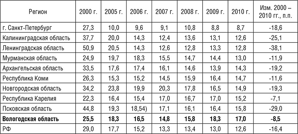Таблица 2.9. Доля населения в регионах СЗФО с денежными доходами ниже величины прожиточного минимума, % от общей численности населения региона