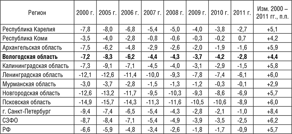 Таблица 2.10. Динамика коэффициента естественной убыли (-), прироста (+) населения регионов СЗФО, на 1000 человек населения