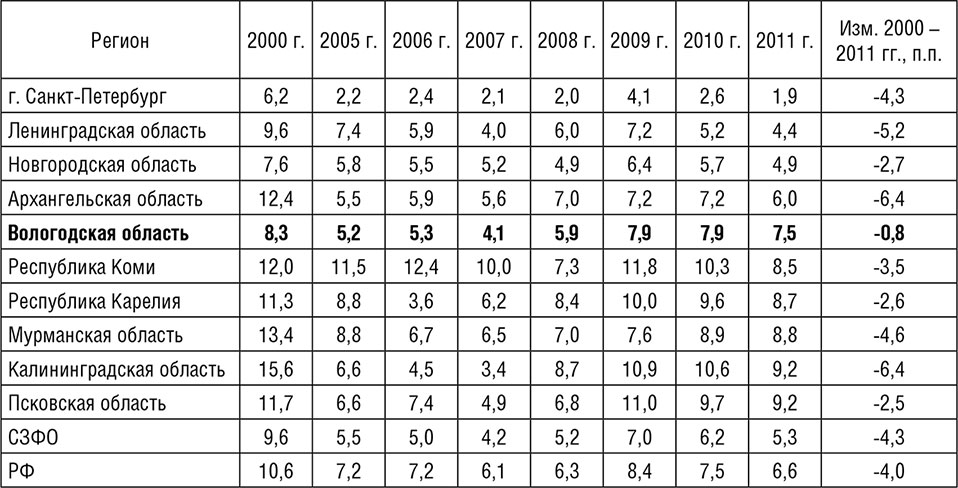 Таблица 2.11. Уровень безработицы населения в регионах СЗФО, %