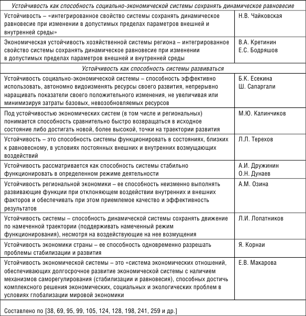 В настоящее время относительно устойчивости социально-экономических систем существует несколько десятков определений, и их количество продолжает расти. Это свидетельствует как о сложности самого понятия, так и сложности объекта исследования. В одних случаях объектом исследования выступает национальная экономика (макроэкономика), в других – региональная экономика (мезоэкономика), в третьих – экономика хозяйствующих субъектов (микроэкономика), в четвертых – подсистемы экономики того или иного уровня.