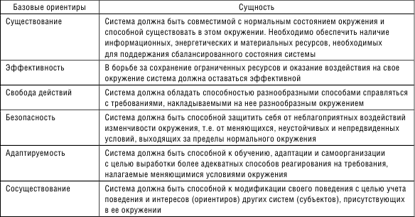 Достаточно обоснованным представляется предложение автора [175] для оценки устойчивости использовать базовые ориентиры системы. По его мнению, для того чтобы сохранять жизнеспособность и устойчивое существование, система должна быть совместима со своим окружением и его характерными свойствами. При этом ученый рассматривает свойства окружения с точки зрения наложения на систему определенных требований и ограничений, направляющих ее функции, пути развития и поведение. В качестве базовых ориентиров системы выступают: существование, эффективность, свобода действий, безопасность, адаптируемость и сосуществование (табл. 1.9). Показатели для оценки устойчивости выбираются с учетом возможности оценки подсистем (общественной, экологической и обеспечения), а также специфики системы.