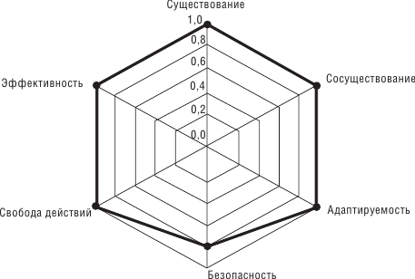 Показатель Бьесиота относится к разряду безразмерных; он соответствует единице, если обе скорости равны между собой. Значит, единица служит критической отметкой: если скорость реагирования окажется выше скорости распространения угрозы, то система будет способна справиться с этой угрозой, т. е. она жизнеспособна, устойчива; если же – ниже, то системе будет угрожать опасность. Состояние степени устойчивости системы достаточно наглядно можно изобразить с помощью звезды ориентиров (рис. 1.6). Следовательно, система устойчива в том случае, если все показатели больше единицы или равны ей.