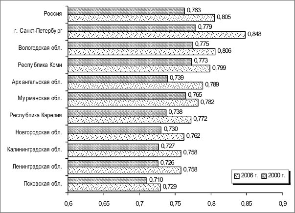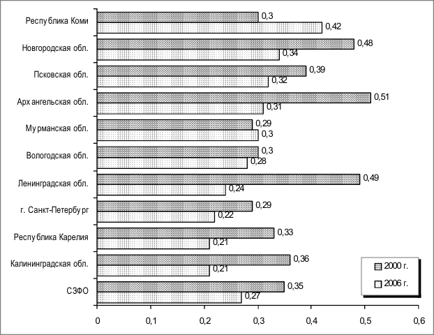 Необходимо отметить, что в 2000–2006 гг. в целом по Северо-Западному федеральному округу произошло незначительное снижение индекса сильной устойчивости – с 0,35 до 0,27 (рис. 2.8).
