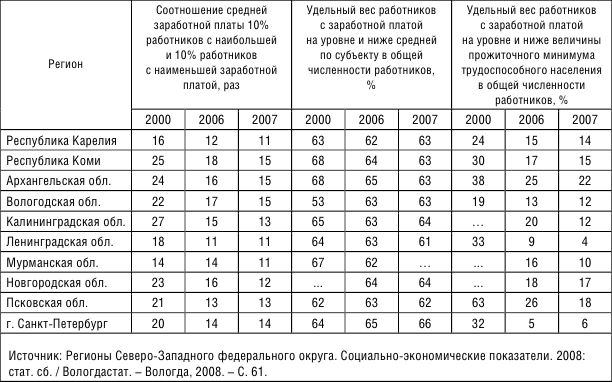 Один из показателей, свидетельствующий о наличии неравенства в регионах СЗФО, – дифференциация по уровню заработной платы. Удельный вес работников с заработной платой на уровне и ниже величины прожиточного минимума трудоспособного населения в общей численности работников в 2007 году в Новгородской и Псковской областях составлял 17 и 18 % соответственно, а в Архангельской – 22 %. Соотношение между средней заработной платой высоко– и низкооплачиваемых работников доходило до 15 раз (табл. 2.7). Заметим, что для основной части трудоспособного населения заработная плата – единственный источник дохода.