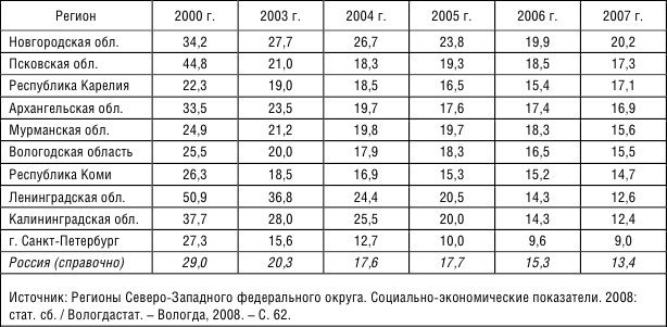 Выше среднероссийского уровень бедности и в других регионах округа, кроме Ленинградской и Калининградской областей, а также в г. Санкт-Петербурге. Судя по предварительным данным органов статистики, финансово-экономический кризис и без того острую проблему бедности населения возводит в разряд актуальнейших.