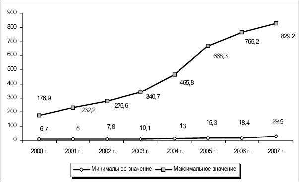 Рис. 2.9. Динамика минимального и максимального значений валового регионального продукта (по всем регионам РФ), рублей на душу населения