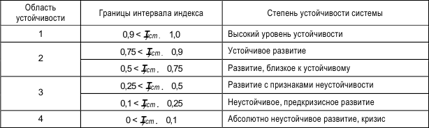 Для этих целей следует установить пороговые значения индекса устойчивости. Интегральный индекс устойчивости может находиться в пределах от 0 до 1. Следовательно, можно выделить шесть уровней устойчивости региональной социально-экономической системы, которые объединены в четыре области устойчивости (табл. 2.13).