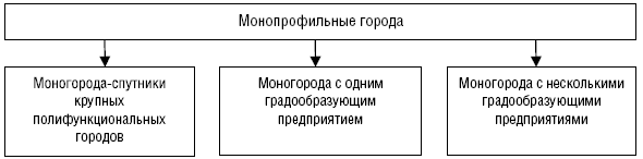 • монофункциональные города, где единственная функция реализуется ограниченным числом градообразующих предприятий, выпускающих недиверсифицированную продукцию, значительная часть которой поступает не на конечное потребление, а на последующую переработку;