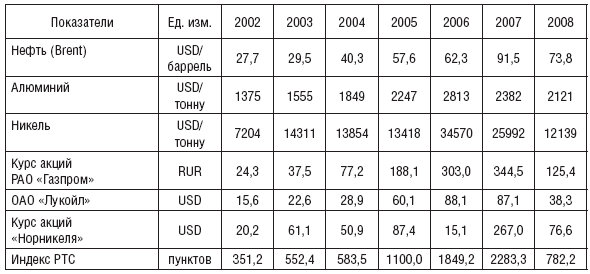 Таблица 1. Динамика цен на основную экспортную продукцию и акции крупнейших компаний.