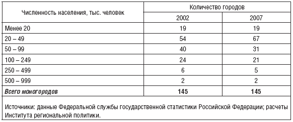 В период 2002—2007 гг. численность населения монопрофильных городов сократилась на 0,6 млн. человек. Тенденция снижения численности населения отмечается в 117 моногородах, при этом наибольшее сокращение наблюдается в городах металлургических компаний (Воркута, Саяногорск, Миасс, Ревда, Норильск, Нижний Тагил). Всего за пять лет численность населения 13 металлургических городов сократилась на 300 тыс. человек. В городах нефтяных и газовых компаний, несмотря на удаленность от основной полосы расселения, численность населения продолжает расти, как это было в Советском Союзе, в основном благодаря более высокой заработной плате.