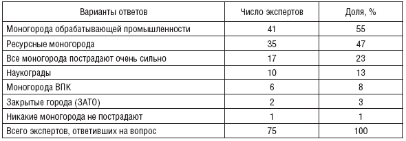 Таблица 3. Распределение ответов экспертов на вопрос: «Какие типы моногородов в наибольшей степени пострадают от кризиса мировой финансовой системы?».