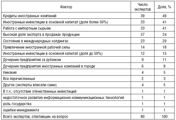 Кредиты иностранных компаний, иностранные инвестиции в основной капитал с долей более 50% и работа с импортным сырьем – наиболее негативные факторы, которые могут усугубить положение российских предприятий в условиях мирового финансового кризиса. Почти половина экспертов выделила эти способы включения предприятий в глобальный экономический обмен как негативные в период кризиса (табл. 4). Факторами второго эшелона (их отметила треть экспертов) являются высокая доля экспорта в продажах продукции и состояние в международных холдингах. Менее негативно скажутся на развитии российских предприятий привлечение иностранной рабочей силы и иностранные инвестиции в основной капитал с долей менее 50%, которая не дает право решающего голоса при определении курса развития компании. Наличие дочерних предприятий за рубежом и иностранных компаний в городе вряд ли усугубят положение российских предприятий в условиях мирового финансового кризиса, в отличие от иных способов включения в глобальный обмен. Данные факторы отметили в качестве негативных только 11 и 8% экспертов соответственно.