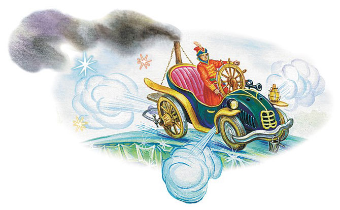 Засвистела, зашумела, загудела, задрожала машина, в звонок зазвонила, жаром-паром запыхтела, скакнула и поехала. Ехали, всю дорогу качались – спасибо, недалеко было, всего один мост переехать.