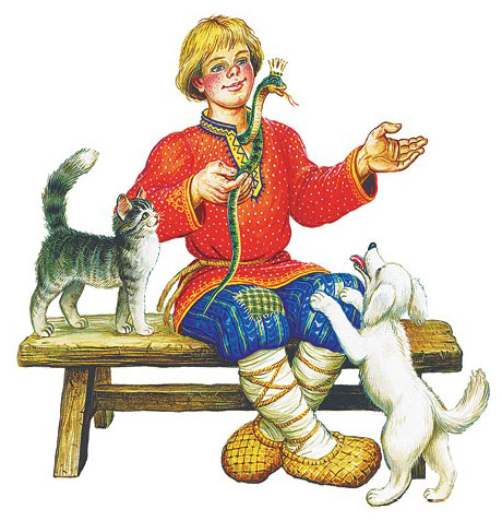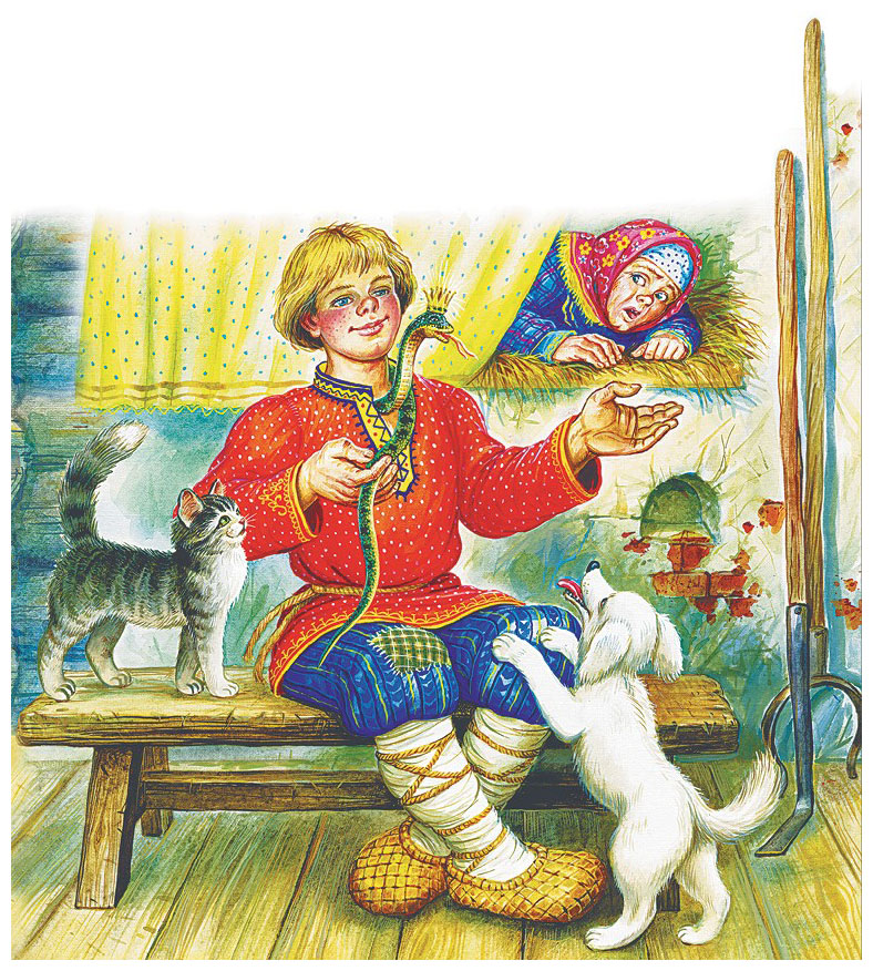 Вот и стали жить – собака белая да кошка серая, Семён с матерью да змея Скарапея, а всего пятеро.