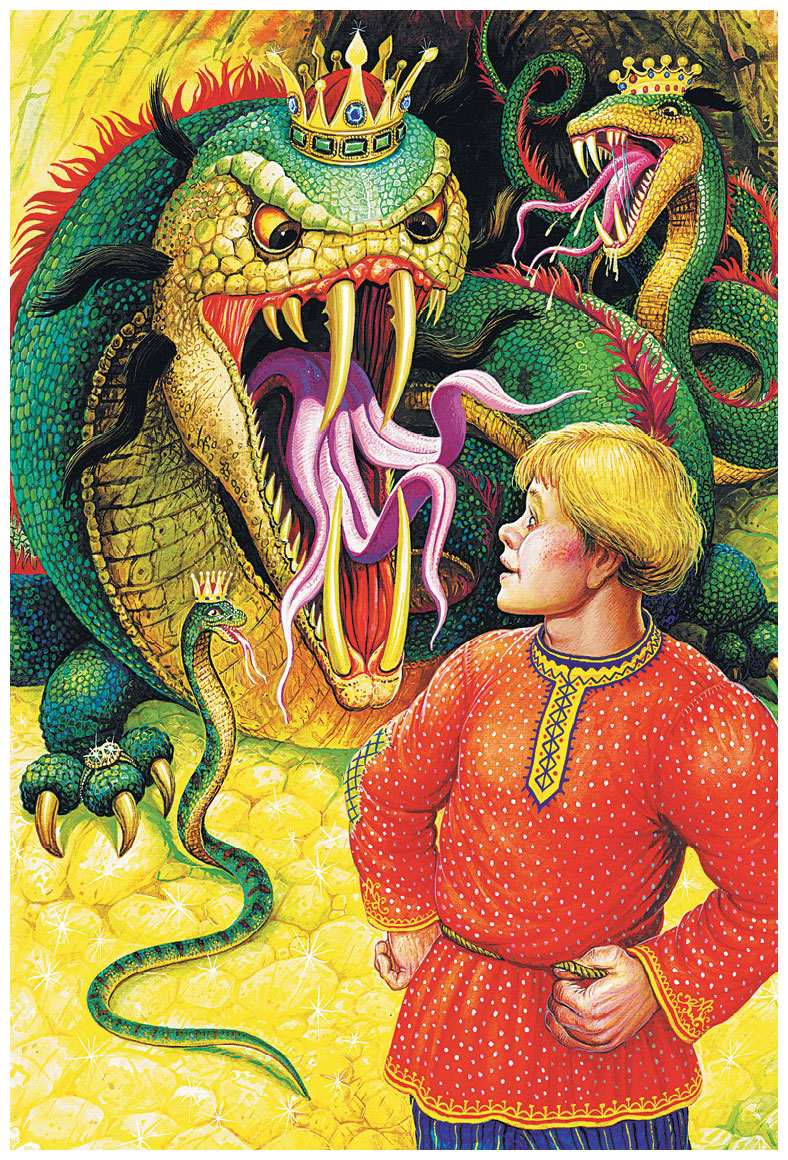 – Не бойся ничего, сейчас доползём, это уж змеиное царство началось, видишь? А я змеиного царя дочь, и сейчас мы увидим моего отца. А теперь слушай. Вот когда я скажу ему, как ты меня спас, он поблагодарит тебя и даст тебе много золота, а ты золото не бери, а попроси одно золотое кольцо, что у отца на пальце. Кольцо это волшебное. Отец для меня его бережёт, а я хочу тебе его подарить.