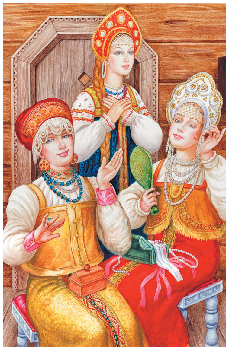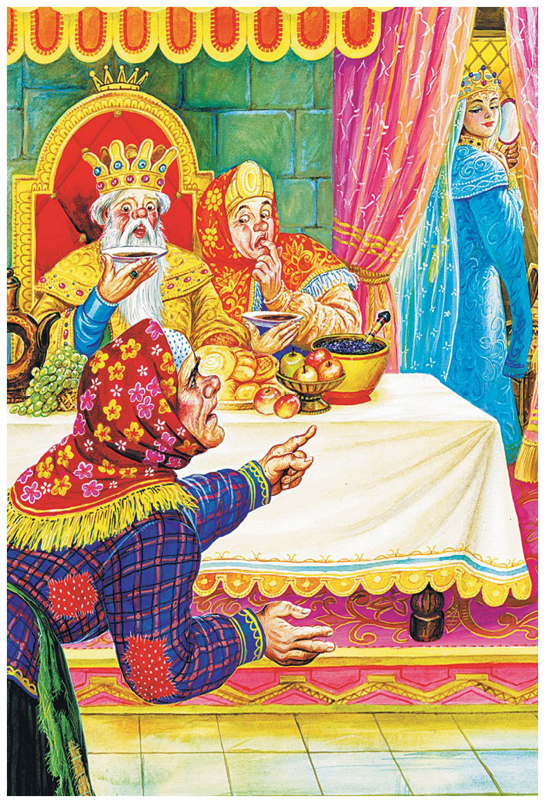– Ой, тошно! – шумит царица. – Ох, укачало, растрясло и растрепало! Ой, шут с тобой, где ты есть, жених-то? Бери девку, а мы-то уж обратно пешком пойдём!