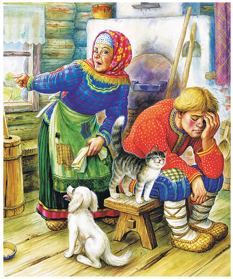 Увели от матери сына, не стало у неё кормильца. Оголодала старуха. Кликнула она кошку и собаку и пошла побираться. Под одним окошком хлеба попросит, под другим съест. А тут захолодало, потемнело, лето состарилось, к зиме пошло.