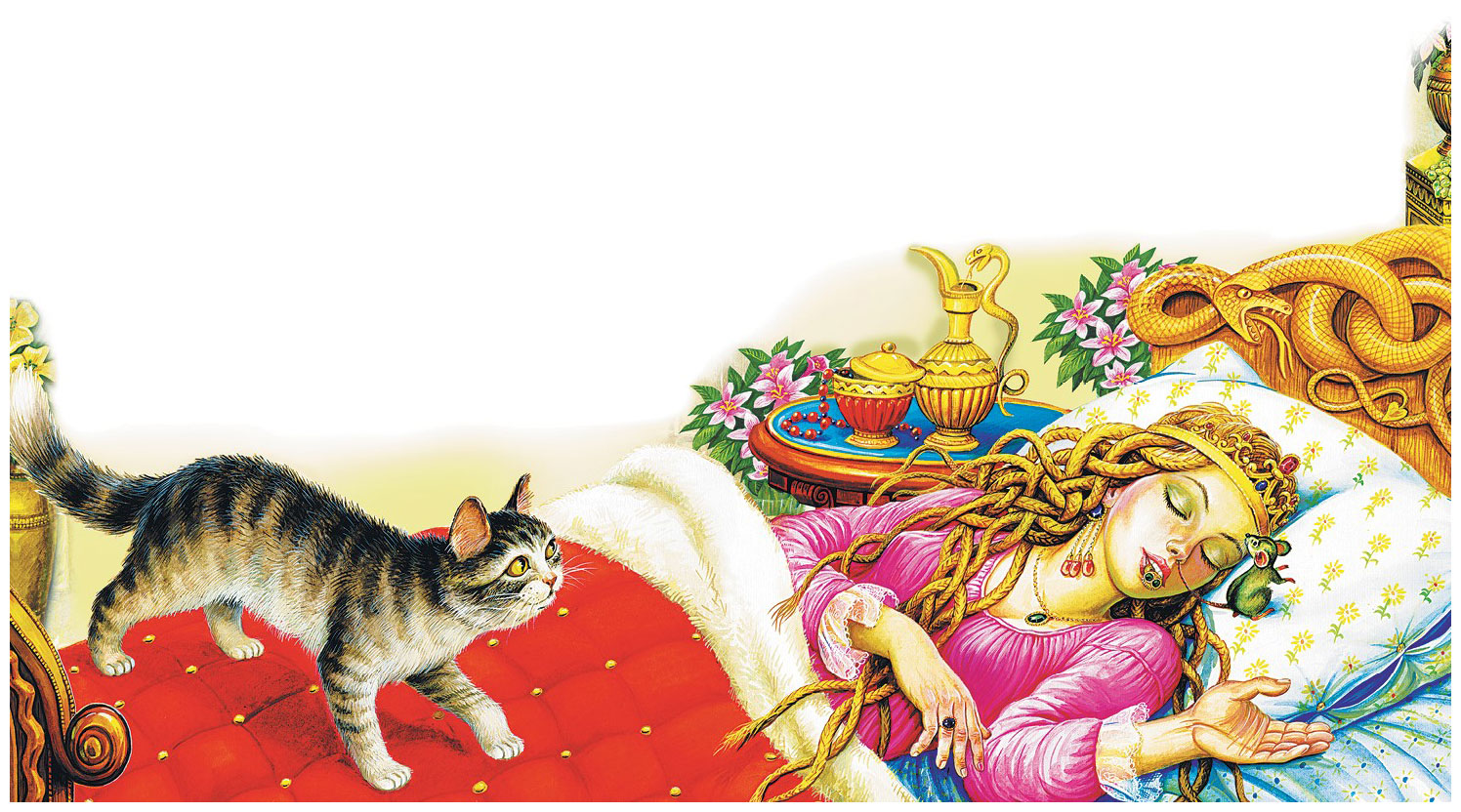 Поймала кошка мышку, надкусила ей ухо и научила её уму-разуму, что мышка должна сделать. Влезла мышка на кровать, неслышно прошла по царевне и стала своим хвостиком свербить у неё в носу. Царевна чихнула, ртом дыхнула, кольцо на пол упало и покатилось. А кошка хвать кольцо – и в окно. Пока царевна проснулась, покуда она туда-сюда – кольца уж нету, и та мышка, что хвостиком у царевны в носу свербила, уж на кухне корочку грызёт: она-де ни при чём.