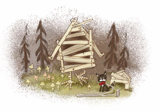 Принюхивается, озирается. Да разве сыщешь лешего в родном лесу! Одни поганки белеют на полянке, да Дятел стучит в стену дома.